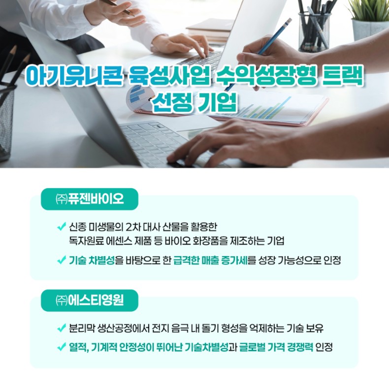 선정기업 중 퓨젠바이오는 신종 미생물의 2차 대사 산물을 활용한 독자 원료 에센스 제품 등 바이오 화장품을 제조해 급격한 매출 증가를 이룬 곳이다. 에스티영원은 분리막 생산공정에서 전지 음극 내 돌기 형성을 억제하는 기술력이 인정받았다. 중기부 관계자는 “외부 투자유치 없이 자체적인 매출과 수익을 통해 성장하는 기업에 대한 맞춤형 지원도 필요하다”며 “벤처천억기업으로 성장할 수 있도록 적극 지원하겠다”고 말했다.